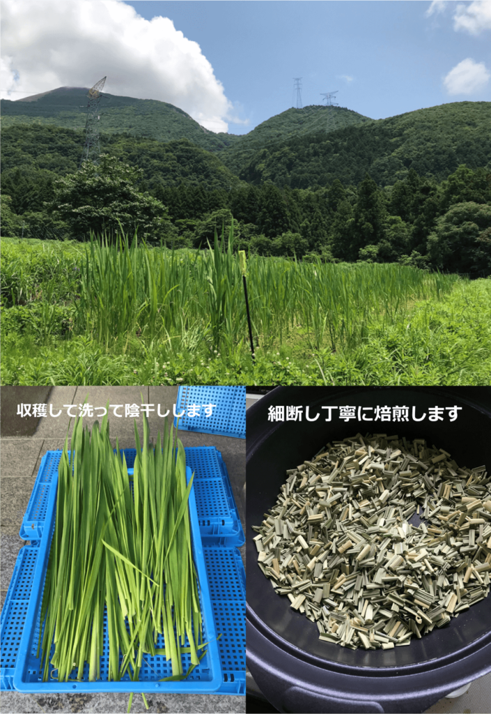 伊吹山の湧水を直接引き込んだ棚田で、自然栽培で育てているマコモ。その葉を刈り、洗って天日で乾かし、さらに乾燥機で乾燥、丁寧に焙煎してお茶にしました。